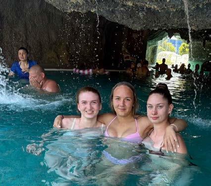 Becsekkolás után megrohamoztuk a fürdőket és egy gyors öltözködés után már várt is ránk a strandolás. Az első medence, amit kiszemeltünk magunknak az élménymedence, ahol a víz forogva vitt minket, buborékok törtek föl a mélyből és vízfüggöny alatt szórakoztuk ki magunkat. Miután kifárasztottuk magunkat a medencében, egy osztálykedvenc játékkal fojttattunk a teendőnket a homokos röplabdapályán.