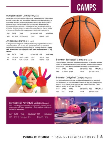 Camps Dungeon Quest Camp (10-17 years) Come have a fantastically fun afternoon at The Keller Pointe. Participants enrolled in this class play Dungeons & Dragons to help learn elements of storytelling such as character development, setting and plot line. D&D’s advanced game mechanics will also improve math skills as well as intrapersonal communication, while players have fun taking on goblins and other fiends to protect the realm. Sign up and get the chance to take on a quest and explore the many dungeons within our imaginations.