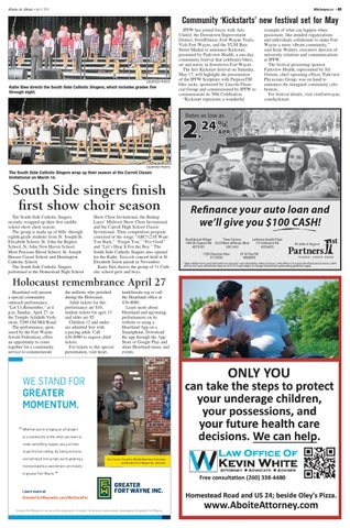 Show Choir Invitational, the Bishop Luers’ Midwest Show Choir Invitational and the Carroll High School Classic Invitational. Their competition program consisted of the songs “ABC/123/I Want You Back,” “Forget You,” “For Good” and “Let’s Hear It For the Boy.” The South Side Catholic Singers also opened for the Kathy Troccoli concert held at St. Elizabeth Seton parish in November. Katie Slee directs the group of 31 Catholic school girls and boys.