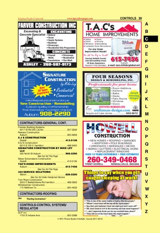 CONTRACTORS-GENERAL CONT. Premier Building Systems 6417 St Rd 205 LaOtto ..........................................................357-3222 Reeves Construction Auburn ....................................................................................................925-6859 S J S CONSTRUCTION Grabill ................................................................................................413-5106 S & S Construction 6215 S 700 E Hamilton ..........................................................488-3405 SIGNATURE CONSTRUCTION BY MIKE LEY LLC 500 North St Auburn ............................................................908-2290 See Our Ad This Page Steve Schumakers Construction Grabill ......................................................................................................413-5106 TAC’S HOME IMPROVEMENTS Auburn ..............................................................................................615-7456 See Our Ad This Page 323 SERVICE SOLUTIONS Albion ..................................................................................................636-2200 See Our Ad Under Handyman Service Tom Rose Construction 3550 E Bellefontaine Rd Hamilton ................................488-3923 Winebrenner Construction 110 Matthew Cv ............................................................................925-4633