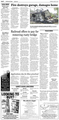 (Publication No. USPS 214-260) Established 1885 Terry Housholder, President Susan M. Carpenter, Publisher 260-925-2611 ext. 45 Entered at Post Office, Garrett, as periodicals postage paid Published by KPC Media Group Inc. at 102 N. Main St., Kendallville, IN 46755 every Monday and Thursday. Open: Mon. - Fri. 8-5 260-925-2611 ext. 45 • Fax: 260-925-2625 kpcnews.com SUBSCRIPTION RATES Home Delivery: $33 - 6 mo. • $44 - 1 yr. In County: $39 - 6 mo. • $52 - 1 yr. Out of County: $50 - 6 mo. - $64 - 1 yr. POSTMASTER: Send address changes to: The Garrett Clipper, P.O. Box 59, Garrett, IN 46738 The Garrett Clipper home office: 1526 CR 56, Garrett; drop-off box at Garrett Public Library, 107 W. Houston St., Garrett MAIL SUBSCRIPTIONS If you receive your paper by mail and are dissatisfied with delivery, you should ask your local postmaster for a Consumer Service Card and record your complaint on that form. If this does not bring about improvements, please contact us.