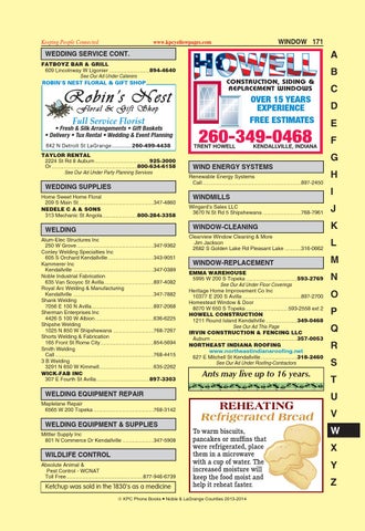 WINDOW-REPLACEMENT EMMA WAREHOUSE 5995 W 200 S Topeka ........................................................593-2769 See Our Ad Under Floor Coverings Heritage Home Improvement Co Inc 10377 E 200 S Avilla ................................................................897-2700 Homestead Window & Door 8070 W 650 S Topeka ..............................................593-2558 ext 2 HOWELL CONSTRUCTION 1211 Round Island Kendallville ..................................349-0468 See Our Ad This Page IRVIN CONSTRUCTION & FENCING LLC Auburn ..............................................................................................357-0053 NORTHEAST INDIANA ROOFING www.northeastindianaroofing.net 627 E Mitchell St Kendallville ........................................318-2460 See Our Ad Under Roofing-Contractors