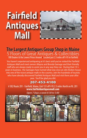 Fairfield Antiques Mall The Largest Antiques Group Shop in Maine 5 Floors of Great Antiques & Collectibles 100 Dealers & the Lowest Prices Around • Located just 2.5 miles off I-95 in Fairfield
