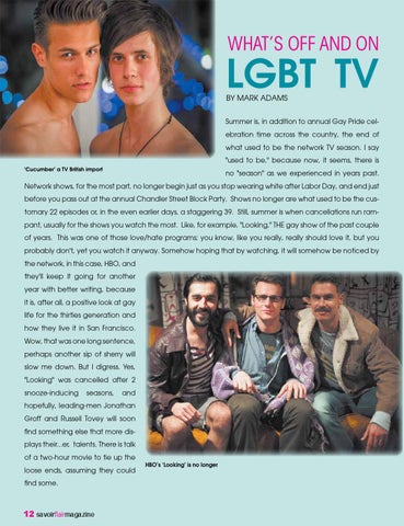 Summer is, in addition to annual Gay Pride celebration time across the country, the end of what used to be the network TV season. I say "used to be," because now, it seems, there is no "season" as we experienced in years past. Network shows, for the most part, no longer begin just as you stop wearing white after Labor Day, and end just before you pass out at the annual Chandler Street Block Party. Shows no longer are what used to be the customary 22 episodes or, in the even earlier days, a staggering 39. Still, summer is when cancellations run rampant, usually for the shows you watch the most. Like, for example, "Looking," THE gay show of the past couple of years. This was one of those love/hate programs; you know, like you really, really should love it, but you probably don't, yet you watch it anyway. Somehow hoping that by watching, it will somehow be noticed by the network, in this case, HBO, and they'll keep it going for another year with better writing, because it is, after all, a positive look at gay life for the thirties generation and how they live it in San Francisco. Wow, that was one long sentence, perhaps another sip of sherry will slow me down. But I digress. Yes, "Looking" was cancelled after 2 snooze-inducing