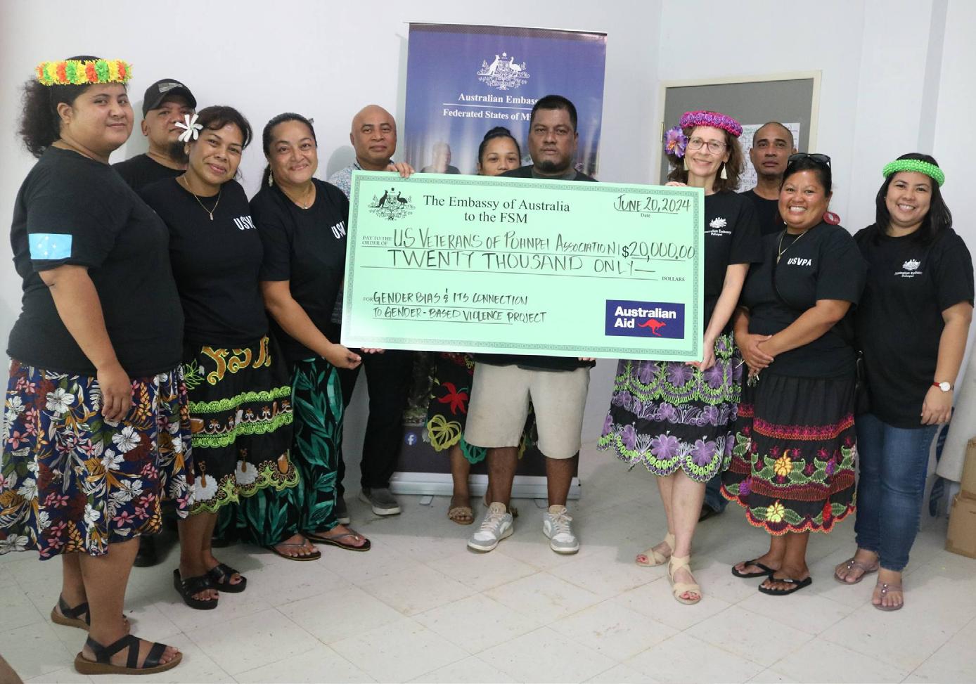 Pohnpei—Ambassador Jenny GrantCurnow and her team were thrilled to hand over the Direct Aid Program (DAP)-FSM Women’s Community grant for $20,000USD to the US Veterans of Pohnpei Association to support their upcoming project on gender-based violence.