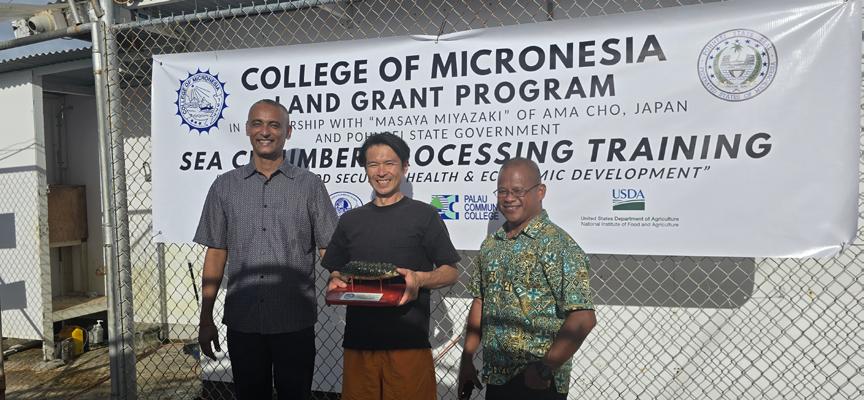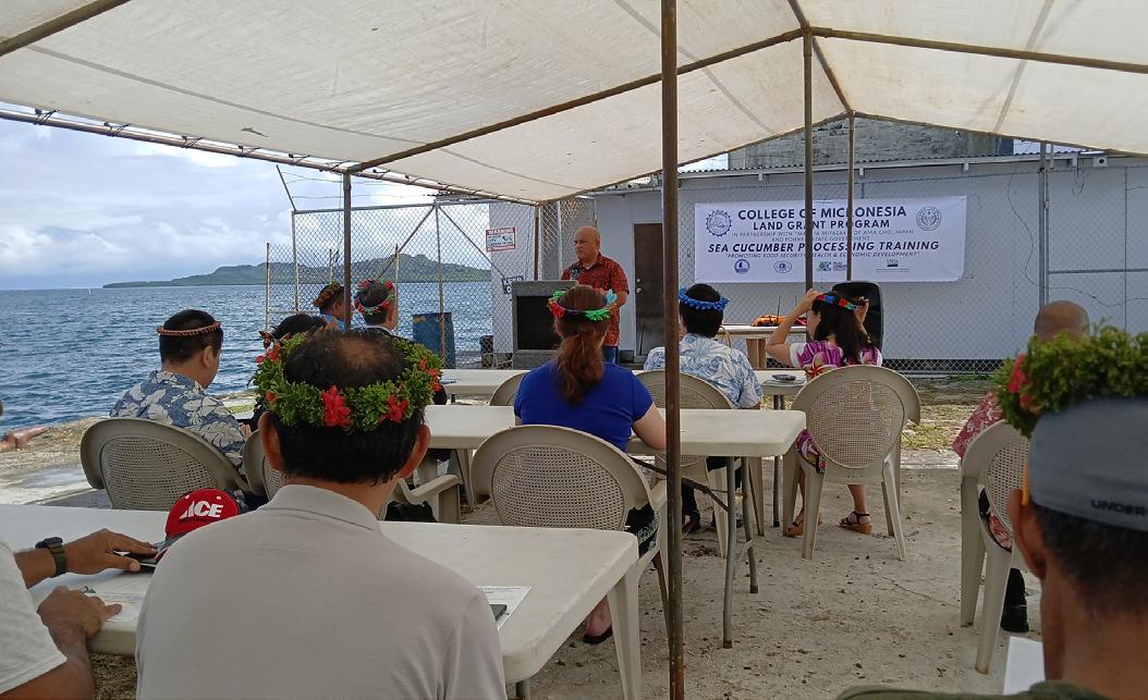 Pohnpei—The College of Micronesia's Land Grant Program (COM LGP), in partnership with the Pohnpei State Offices of Resources and Development (R&D) and the Office of Fisheries and Aquaculture (OFA), recently conducted a two-day trainer’s training on sea cucumber processing led by Mr. Masaya Miyazaki of Ama Cho, Japan, on Tue Nov 26th and Wed Nov 27th. The event took place at COM LGP Program hatchery facility in Nett Point. The main focus of this training was to train selected key trainers on how to process sea cucumbers, particularly the sandfish that’s being hatched by aquaculture researcher Dr. Manoj Nair and his aquaculture research team at the experimentation station at Nett Point. Ultimately after the trainers satisfactorily complete the training, they would then provide the same training in each of their communities with the goal of promoting food security, health and economic development throughout.