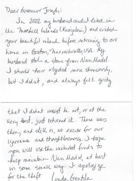“On behalf of the people of Pohnpei, I extend my gratitude to Mrs. Gentile and her husband for their honesty and desire to make things right. Their actions demonstrate the profound respect our visitors can develop for the cultural and historical treasures of Pohnpei,” Governor Joseph added.