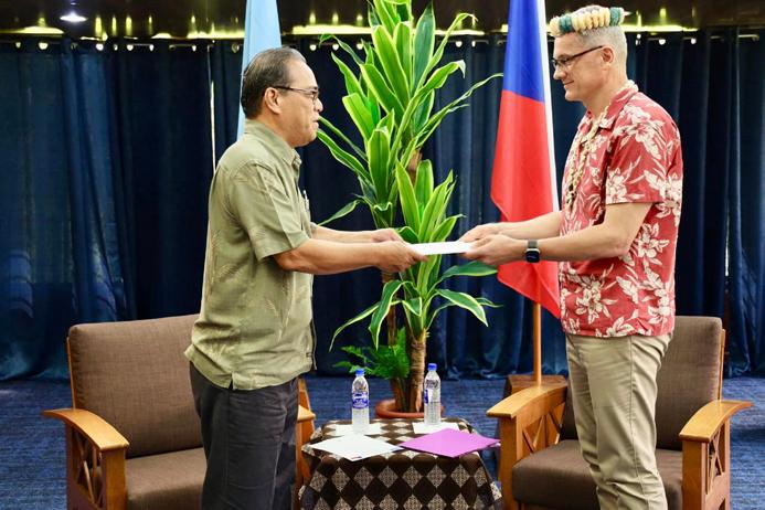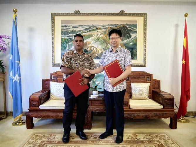 FSM—On December 11, the Chinese Embassy in the FSM held a handover ceremony of the Funding by Shandong Province for Kosrae International Airport VIP lounge project. Ambassador Wu Wei attended the ceremony and handed over the cash payment voucher to T.H. Tulensa Palik, Governor of Kosrae State.