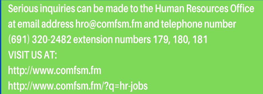 **Serious inquiries can be made to the Human Resources Office at email address hro@comfsm.edu.fm and telephone number (691) 320 -2482 extension numbers 215, 180 or visit us at www. comfsm.fm .