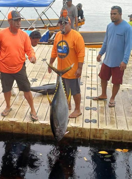 gift certificates. The second-largest fish was a 48.8-pound yellowfin caught by Westcott Panuelo, netting him a $350 cash prize. Canally Torres also caught a 49.8-pound yellowfin, tying with Westcott and receiving $350 as well. Hilarko David landed two impressive yellowfin—one at 46 pounds and another at 45.4 pounds— earning her a combined $350 for the fifthand sixth-largest fish of the day.