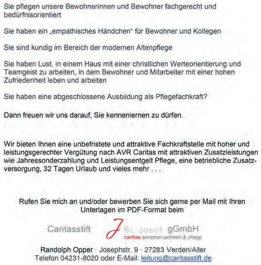 rbe-stuhr.de Besuchen Sie unsere große Ausstellung! Steller Straße 2 28816 Stuhr|Großmackenstedt Telefon: 04206|41 62-0 GLASHÄUSER Goodbye ZugluftIntelligentsanieren Mehr Wärme,weniger Heizkosten, Energie+CO2! NeueDichtungen fürFensteru. Türen vomProfi 3794166-0 Beratung| Ve rkauf|Einbau Bremen, Neide ,www.dollex.de ❄ TOP AUSWAHL TOP QUALITÄT TOP PREISE ÖFFNUNGSZEITEN: Mo.-Fr. 8-18 Uhr, Sa. 8-13 Uhr, So. 10-12 Uhr Armsener Dorfstr. 12 27308 Armsen Telefon (0 42 38) 3 25 Telefax (0 42 38) 7 50 beste Pflanzen beste Preise Verlängerte Ö nungszeiten an den Mai Wochenenden Blumensamstage8-16 Uhr Blumensonntage10-13 Uhr Sundaville-Pyramide mit intensiv roten Blüten für vollsonnige Standorte 19 cm Topf 14,99 Husarenknöpfchen `Sanvitalia` sehr beliebte Sommerblume, vielseitig verwendbar, 11cm Topf 0,99 Gefülltes Trio Zauberglöckchen Verschiedene Farbmischungen, 12cm Topf 2,99 Urlaub mal anders gebucht Mobile Reiseberater bieten ihrem Klientel ein Plus an Flexibilität Biergipfel in der Waldbühne Was die Bremer Promis bei Spargel und Fassbier zu besprechen hatten Die Weser Report-Ausgabe für den Landkreis Verden ACHIM/OYTEN/VERDEN