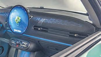 Im Innenraum fallen das neugestaltete Lenkrad, das runde OLEDDisplay und die Mini-typische Kippschalterleiste unterhalb des Armaturenbretts mit zweifarbiger Textil-Oberfläche auf.