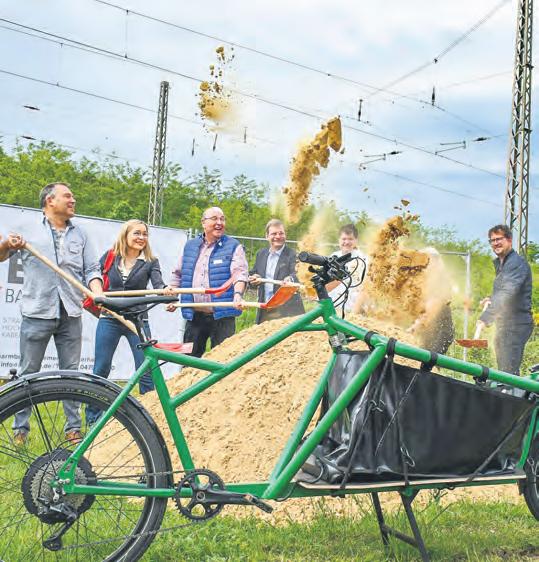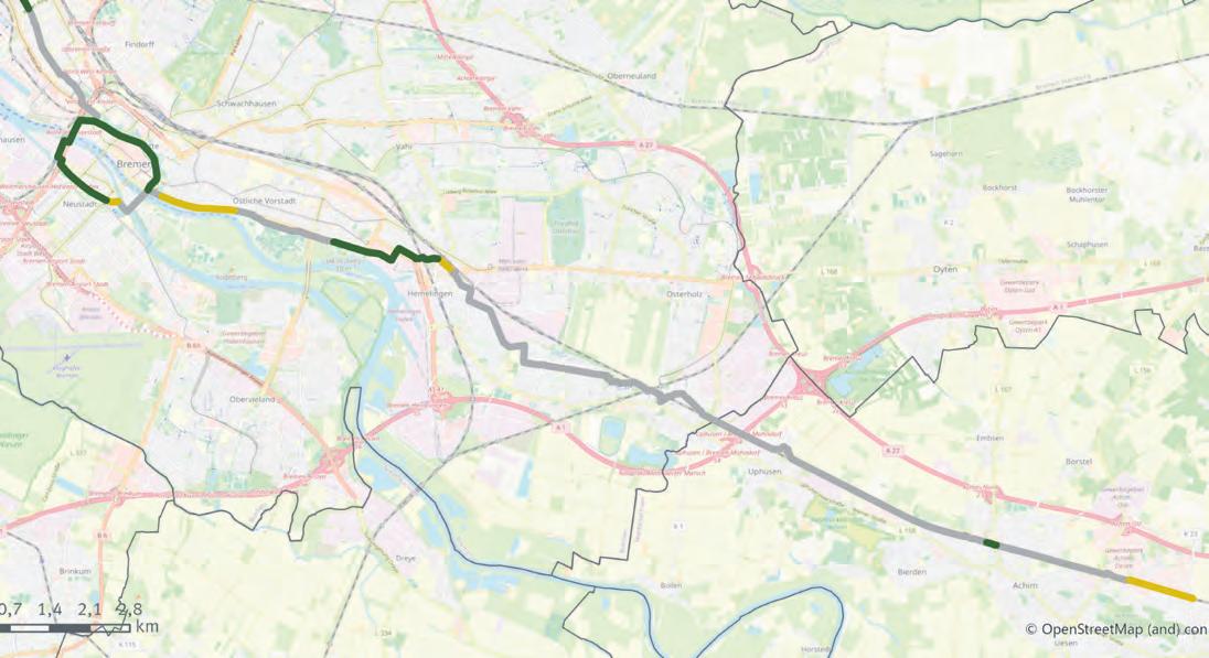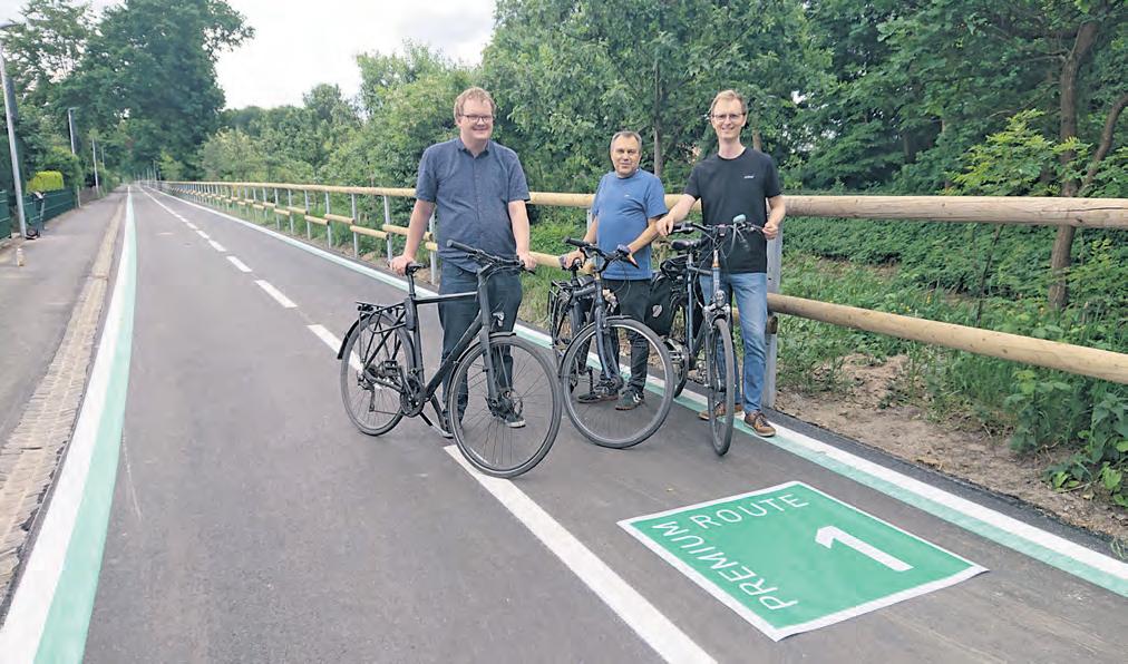 Mehr Qualität wagen: Zur Premiumroute 1 werden künftig auch namentlich die im Ausbau befindlichen Radschnellwege D.15 (Bremen) und Rasch (Achim) zusammengeführt. Für die neue Radlerroute, die in wenigen Jahren Bremen und Achim verbinden soll, werden hier Timo Rauch (Bremer Bausenat), Stefan Schuster (Verkehrsplanung Stadt Achim) und Lennart Kersting (Kommunalverbund Niedersachsen/Bremen; siehe auch den Artikel auf Seite 7 dieser Ausgabe). Foto: Kommunalverbund