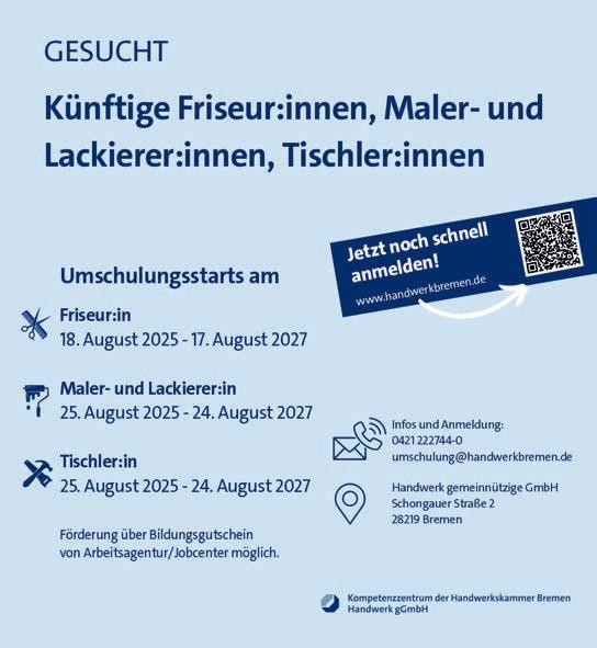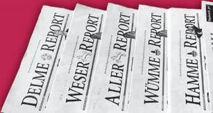 Kleinanzeigen: Tel. 690 55 400, Fax 690 55 500 Gestaltete Anzeigen: Tel. 690 55 102 info@weserreport.de Zurzeit gelten Anzeigenpreisliste Nr. 52 vom 1. Januar 2025 und unsere darin abgedruckten AGB. Falls Sie dieses Produkt nicht mehr erhalten möchten, bitten wir Sie, einen Werbeverbotsaufkleber mit dem Zusatzhinweis „Keine kostewnlosen Zeitungen“ an Ihrem Briefkasten anzubringen. Weitere Informationen finden Sie auf dem Verbraucherportal www.werbung-im-briefkasten.de Internet: www.weserreport.de Druck: DruckHaus Delmenhorst GmbH Verbreitete Auflage: 267.910 Exemplare mit DELME REPORT, HAMME REPORT und WÜMME REPORT 351.410 Exemplare