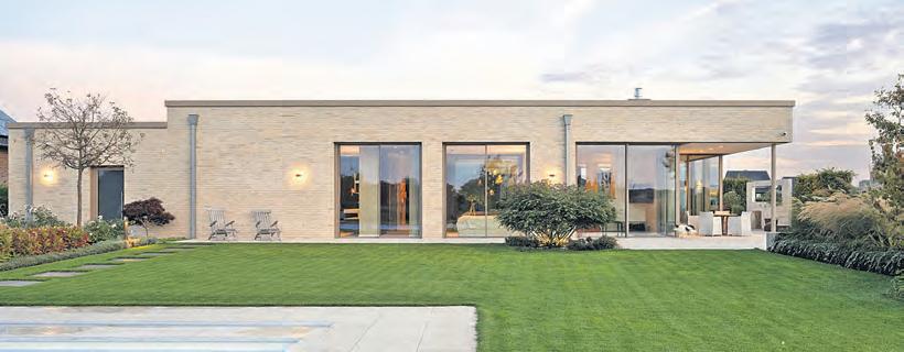 rich, der bewusst als barrierefreier Bungalow geplant wurde. „Nach einem gesundheitlichen Einschnitt wollten wir ein Haus, das zu uns passt – heute und in Zukunft“, berichtet der Bauherr. Herzstück des Hauses ist ein zentral gelegenes Atrium, das Licht in alle Räume bringt. Großflächige Schiebefenster verbinden In-