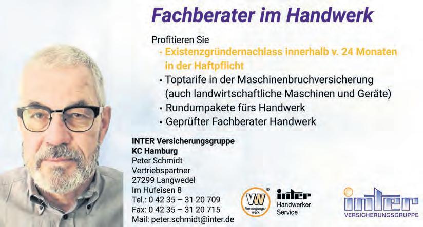 rbe-stuhr.de Besuchen Sie unsere große Ausstellung! Steller Straße 2 28816 Stuhr|Großmackenstedt Telefon: 04206|41 62-0 HAUSTÜREN Essen auf Rädern in Verden & umzu Täglich wechselnde Wahl-Menüs –7 Tage die Woche wohlschmeckend & frisch an Ihre Haustür. St. Johannisheim e.V. Ritterstraße 8, 27283 Verden ���� 04231 / 9142-0 info@st.johannisheim.de www.st.johannisheim.de Unser Probier-Angebot für Neukunden: 3 Tage je 1 Menü für je 5,50 * *begrenztes Angebot für Senioren 2 Brillen kaufen und sparen * 50% *Gültig ab 01.05.23 beim Kauf von zwei Brillen in derselben Sehstärke mit Meisterglas ® Brillengläsern, ausg. der Marken Chanel, Dior, Gucci, Ørgreen, Lunor, La Roche, Davidoff. Rabatt wird vom UVP des Herstellers abgezogen. Nur auf vorrätige Ware u. Neuaufträge. Kann nicht mit anderen Aktionen, Paketoder Komplettbrillenangeboten und Gutscheinen kombiniert werden. Optik Hallmann GmbH, Große Str. 27 Flensburg. Auf Gläser +Fassungen! Verden, Große Straße 101 04231/95 19 761 • optik-hallmann.de 25 JAHRE • SEHEN • HÖREN • LEBEN