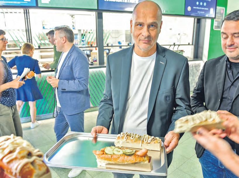Klaus Filbry, Vorsitzender der Werder Geschäftsführung, stellt die drei neuen Signature-Hot-Dogs im Weserstadion vor. Foto: Schlie