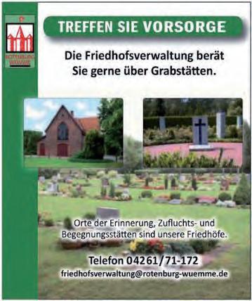 •Rotenburg nimmt erstmalig an dem Aktionstag teil und mit den beteiligten Ausrichtern wurde der 15. September 2024 aus Veranstaltungstag und der Wald friedhof Freudenthalstraße als Veranstaltungsort ausgewählt. Veranstaltungszeit ist von 11.30 bis 17.00 h, wobei eine offizielle Eröffnung um 11.45 h in der Friedhofskapelle mit einer Andacht begangen wird.