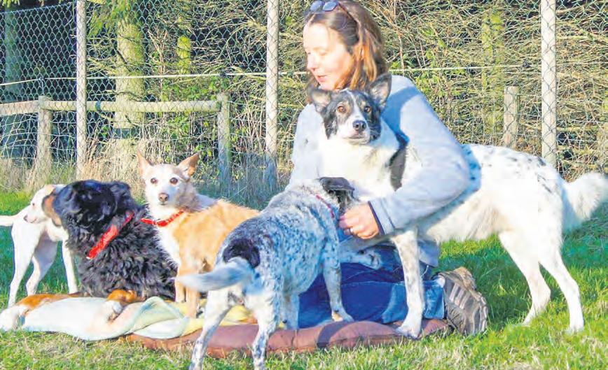 Pflegehund Tayo (l.), ein zweijähriger Podencomix und zurzeit Gast auf Coras Sonnenhof, ist nun bereit für seine eigene Familie. Rechts: Christina Bringmeier mit einigen ihrer vierbeinigen Mitbewohner auf Coras Sonnenhof. Fotos: Coras Sonnenhof