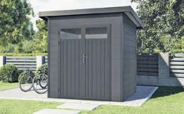 Bausatz aus WPC Steckbrettern, Wendeprofil mit Holzstruktur: einseitig grau, einseitig anthrazit, streichfrei und pflegeleicht, Wandstärke 19mm, Sockelmaß: 200 x 200 cm, inkl. Doppeltür und Zubehör, ohne Fußboden