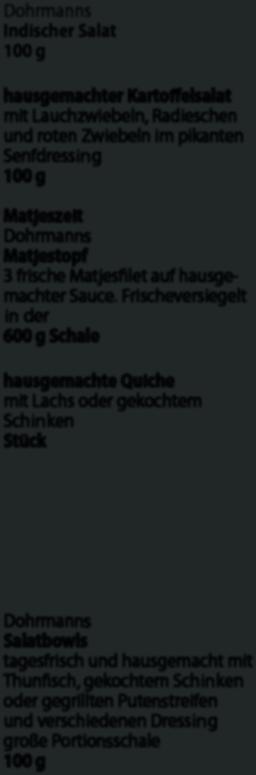 hausgemachte Quiche mit Lachs oder gekochtem Sch㏌ken Stück Dohrman㎱ Salatbowls tagesfrisch und hausgemacht mit Thunfisch, gekochtem Sch㏌ken oder gegrillten Pute㎱treifen und