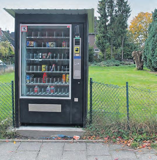 Zum Zeitpunkt des Fotos war der Automat nur spärlich bestückt, was auf einen regen Absatz hindeuten könnte. In einem der Fächer waren Energy-Drinks verfügbar. Über die Marke war in der „Wirtschaftswoche“ zu lesen, dass sie doppelt so viel Ko ein enthielte wie marktgängige Varianten und unter Jugendlichen als eine Art Statussymbol gesehen werde, auch weil sie von einem bekannten amerikanischen In uencer beworben werde. nik Beirat
