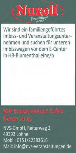 gegnet werden kann. Mit dabei ist unter anderem die Polizei Bremen-Nord mit einem Vortrag. Das Dialog Forum ndet am Dienstag, 29. Oktober, 18.30 bis 21 Uhr, im Vegesacker Geschichtenhaus, Zum Alten Speicher 5a, statt. Die Moderation übernehmen Falk Witte und Andreas Bettray. Um Anmeldungen wird gebeten in der WIR-Geschäftsstelle unter kontakt@ wir-bremennord.de oder unter der Telefonnummer 0421/ 602 87 87. red