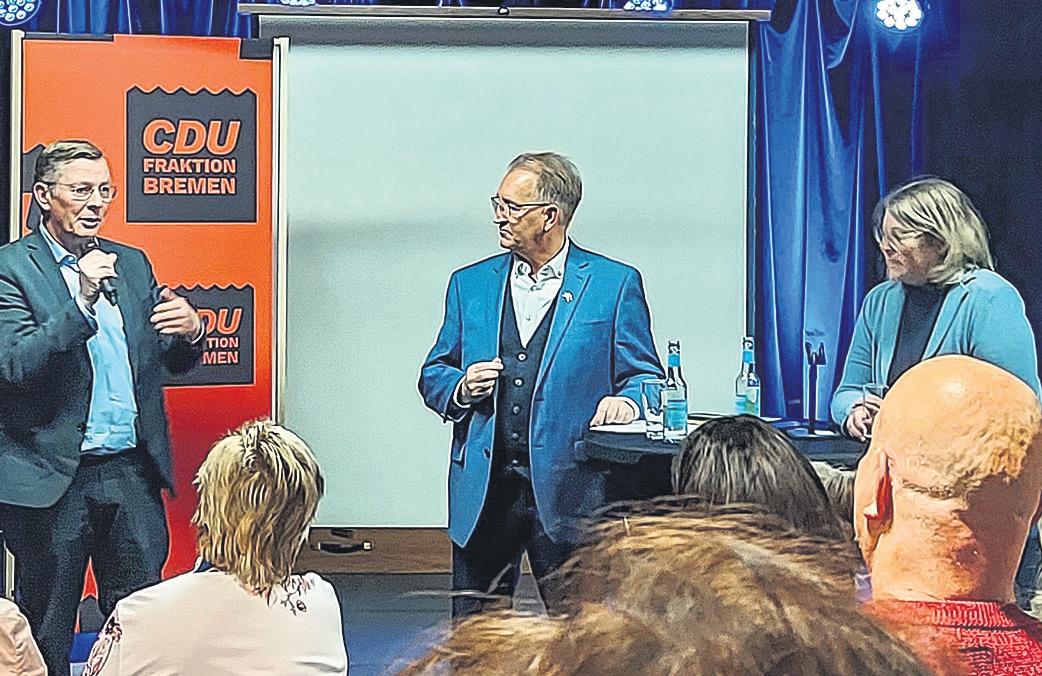 BREMEN-NORD – Kürzlich hatte die CDU Bremen-Nord zu einer Sprechstunde zum Thema Gesundheit eingeladen. Im Bürgerhaus mussten sich Moderator Rainer Bensch, Bettina Hornhues, Vorsitzende des CDU-Kreisverbands, und der Fraktionsvorsitzende Frank Imhoff dazu einiges anhören. Ein Zuschauer berichtete davon, keinen neuen Hausarzt zu finden, nachdem seiner in den Ruhestand gegangen sei. „Ich verstehe den Unmut“, sagt Allgemeinmediziner Michael Rudolph. Er empfahl, immer wieder nach einer Aufnahme zu fragen. „Wir sind häufig auch am Ende der Kräfte“, sprach er die Belastung für sein Team an. Ein anderer Zuschauer fragte nach medizinischen Versor-