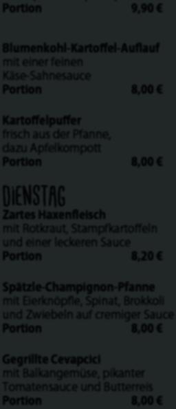 Portion 8,20 € Spätzle-Champignon-Pfanne mit Eierknöpfle, Spinat, Brokkoli und Zwiebeln auf cremiger Sauce Portion 8,00 €