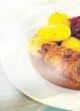 Schweinerücken-Steak „Hawaii“ mit Ananas, Pfirsich und Käse überbacken auf einer BernaiseSauce, dazu Erbsen und Reis