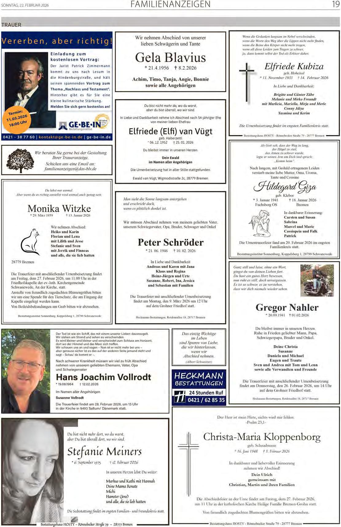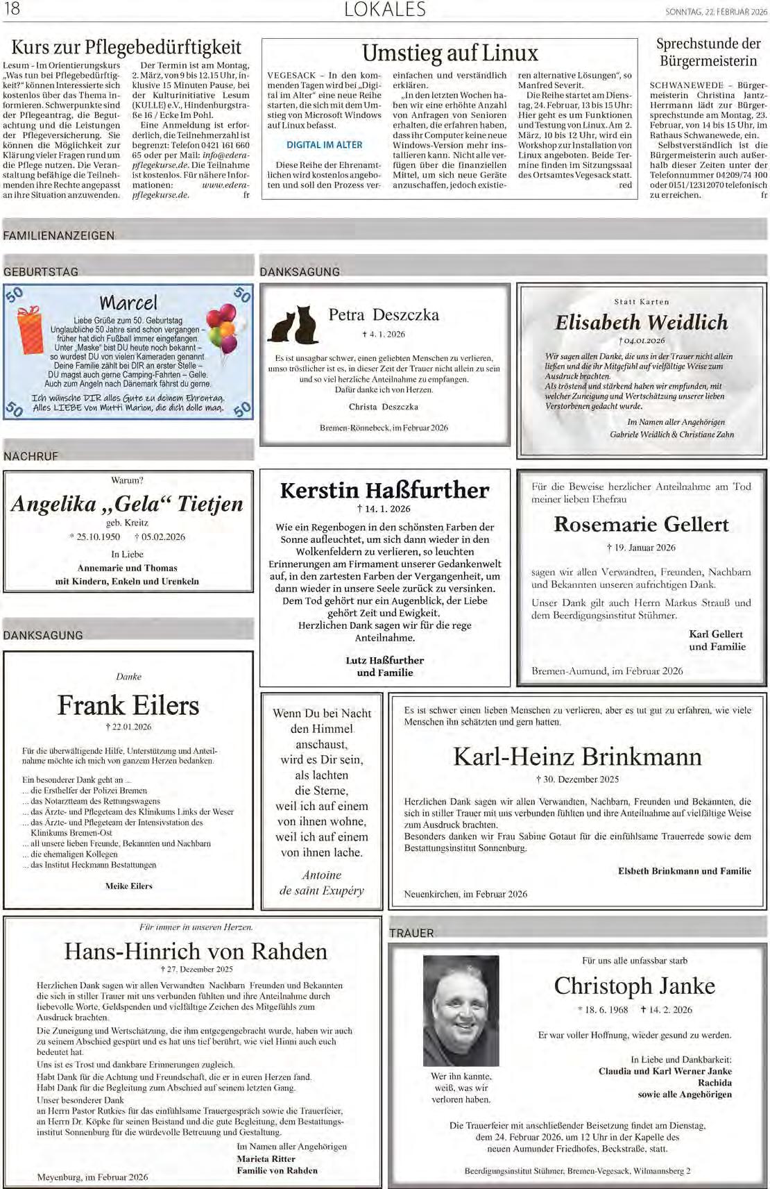 Anzeigenschluss ist jeweils Freitag, 12 Uhr, (Familienanzeigen Donnerstag, 12 Uhr) vor dem Erscheinungstermin.