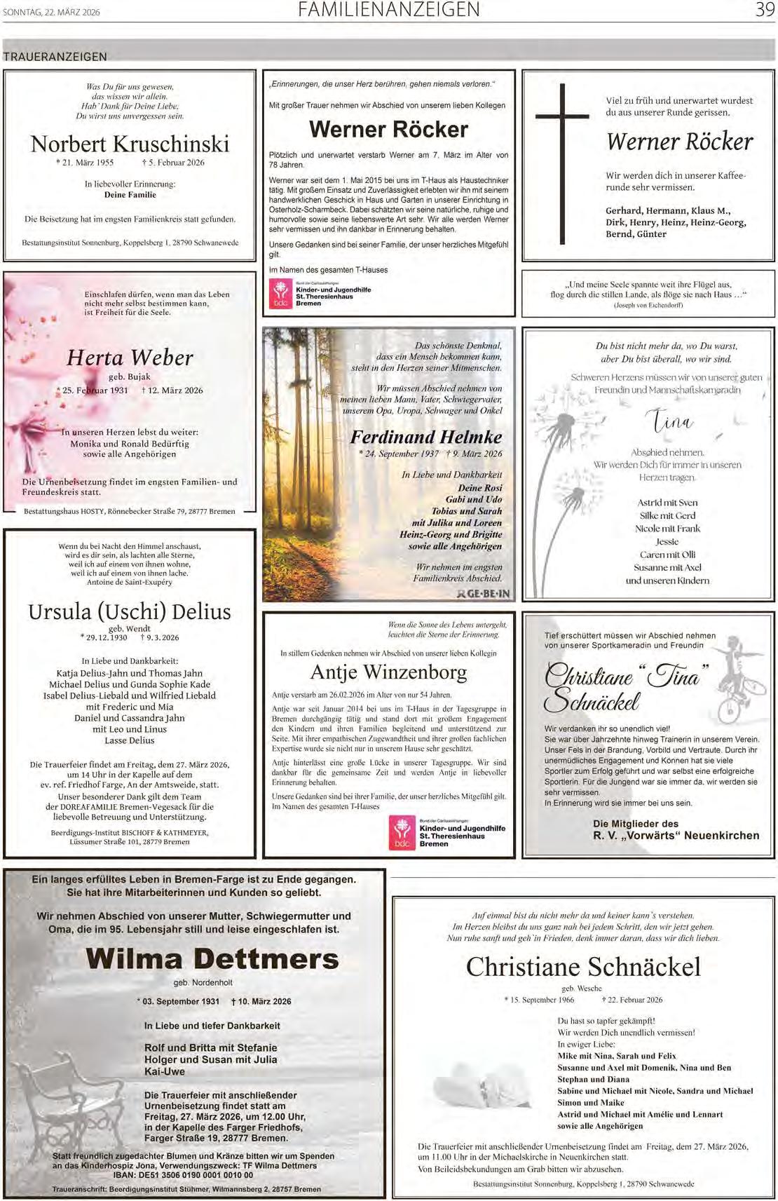 Blumenthal, Farge, Lüssum, Rekum, Rönnebeck, Grohn, Beckedorf, Hagen