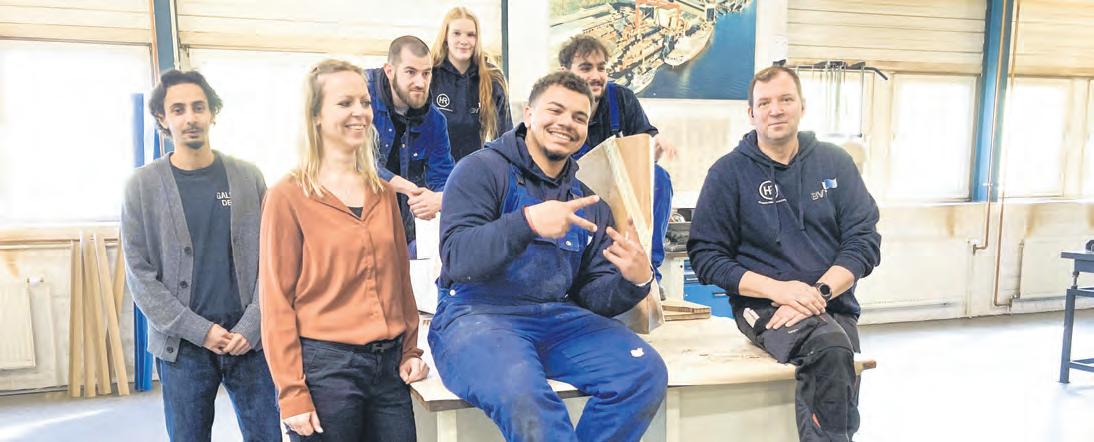 mann, der das Projekt mit den Azubis und Jungfacharbeitern leitet. Gerade mal einen Tag haben sie nach seinem Konzept gebaut, und schon waren die Umrisse zu sehen. „Kreativität und Flexibilität sind gefragt“, so der Ausbilder. „Wenn sie einen Fehler machen, müssen sie es selbst ausbaden.“ Zum schlussendlichen Aussehen will er noch nichts verraten, beim Namen dürfen die Lehrlinge mitentscheiden. Kürzlich stand „Unsichtbares Bootsmobil“ hoch im Kurs. Am großen Tag der Pappbootregatta wollen alle Auszubildenden, die Kollegen und ihre Familien im Vegesacker