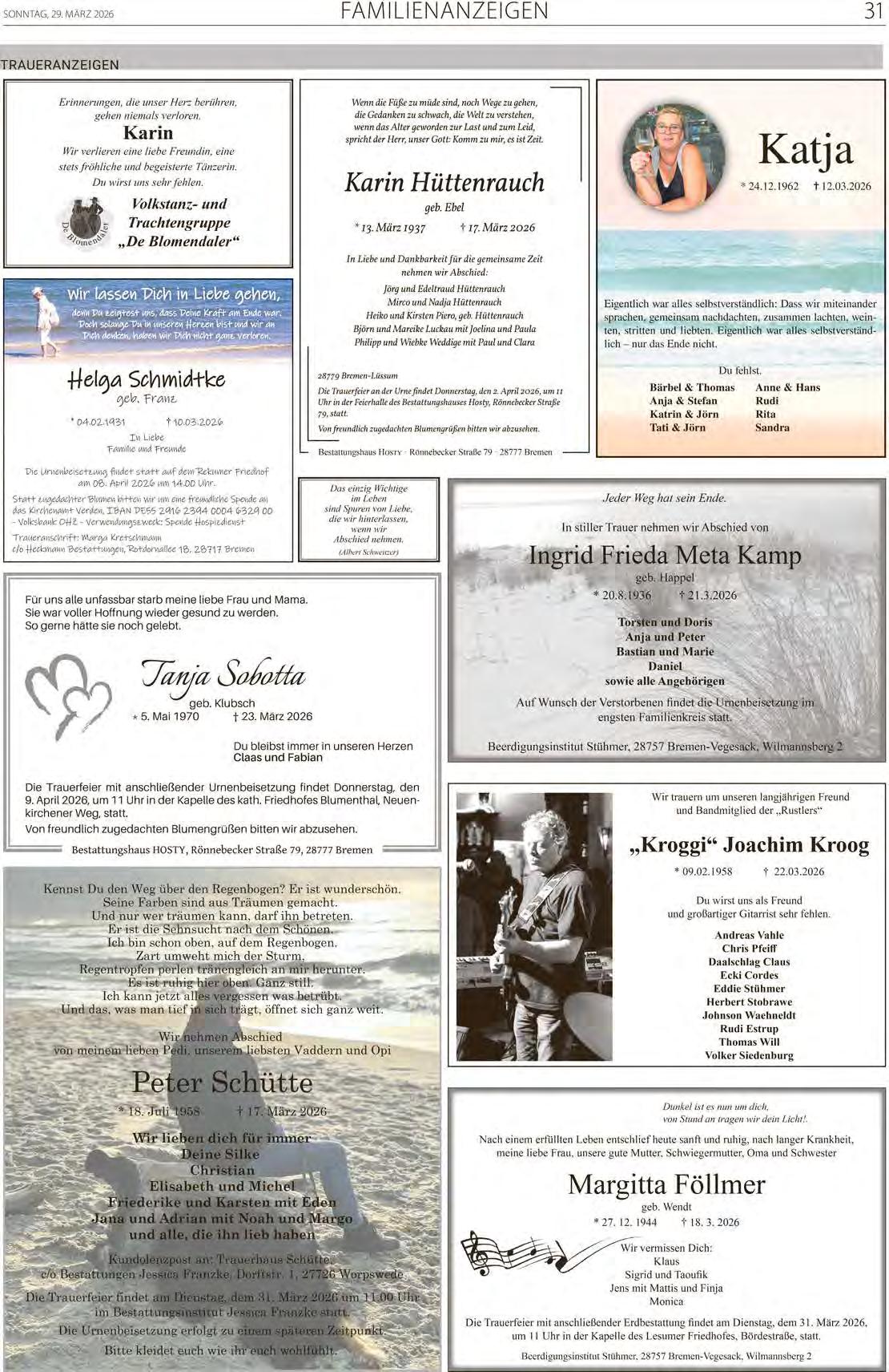 Anzeigenschluss ist jeweils Freitag, 12 Uhr, (Familienanzeigen Donnerstag, 12 Uhr) vor dem Erscheinungstermin.