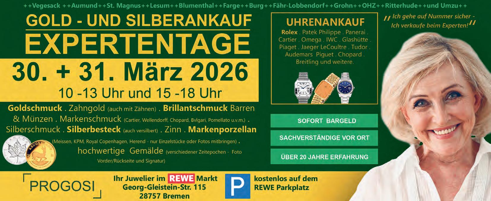 Der heutigen Ausgabe liegen in Voll- oder Teilbelegung folgende Prospekte bei: Aldi, Combi, Dodenhof, E-Center, Edeka, Hagebau, Hol Ab, Jawoll , Jysk, Kaufland , Lidl, Möbel Boss, Nah u. Gut Schwanewede, netto, Penny, Poco, Reformh. Bühring, Reno , Roller, Rossmann, Sonderpreis Baumarkt, Thomas Philipps, toom Baumarkt, Weingärtner, XXXLutz Dodenhof, Zoo & Co.