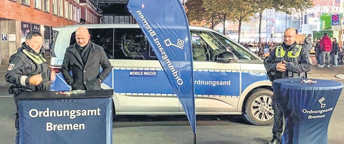 Hauptbahnhof zu verrichten. Mindestens bis zum Tag der deutschen Einheit am 3. Oktober dieses Jahres, teilte Innensenatorin Dr. Eva Högl mit. Stattdessen haben Bürgerinnen und Bürger in Zukunft öfter die Gelegenheit, ihre Anliegen dem Team der „Mobilen Wache“ zu schildern. Das Ordnungsamt hat angekündigt, dieses aus seiner Sicht gelungene Pilotprojekt auszuweiten. Ab sofort ist die Mobile Wache unter dem Motto „Wir sind da“ viermal statt wie bislang zweimal pro Woche im Bremer Stadtgebiet unterwegs. In den vergangenen Monaten hätten die Teams mehr als 2500 Ge-