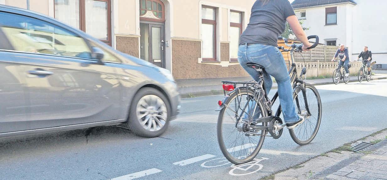 Beispiel Ludwig-Kaufmann-Straße: Kleine Piktogramme führen Radfahrer auf die Fahrbahn, doch der Abstand zwischen Fahrrädern und Autos wird laut ADFC oft nicht eingehalten – ebenso wie das Tempo-30-Gebot. Foto: Konczak