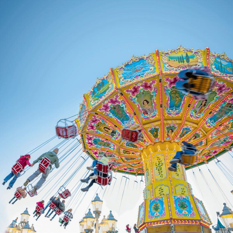 freies Fluggefühl. Bei der Schaukel „Air Power“ stellt sich ein intensives Fahrgefühl ein, wenn sich der Boden unter den Füßen der Fahrgäste absenkt. Es wirken Fliehkräfte von bis zu 4G, also der vierfachen Erdanziehung. In vier Viererreihen pendeln die Passagiere in alle Himmelsrichtungen – nach oben und unten sowie über Kopf.