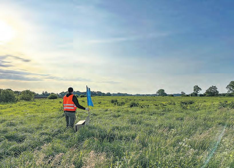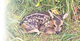 seine Hände sowie Unterarme mit Gras einreibt. „Mein Geruch darf nicht am Kitz haften bleiben, sonst nimmt die Mutter es nicht mehr an“, weiß Heuss. Vorsichtig hebt er den Nachwuchs an und platziert ihn im Karton. „Kitz gesichert“, gibt er weiter. „Bringt es an den Waldrand und markiert es mit dem Wimpel, macht ein Foto und schickt mir den Standort“, lauten die weiteren Anweisungen. Rehkitze zeichnen sich durch ihre braune Fellfarbe und kleine weiße Punkte auf ihrem Rücken aus. In den ersten Lebenstagen geben sie keine Witterung ab. Das erschwert Füchsen und Wölfen das Aufspüren. „Erst nach etwa zehn Tagen geht das Kitz ein paar Schritte mit der Mutter mit, ehe es sich wieder im hohen Gras versteckt. Vorher ist es schutzlos ausgeliefert“, sagt Heuss. Die Ricke, so die Fachbezeichnung für das weibliche Muttertier, sucht ihren Nachwuchs nur zum Säugen und Schlafen auf, um möglichst keine Fressfeinde anzulocken.