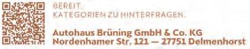SCHÖNEMOORER STRASSE 72 27753 DELMENHORST Telefon 04221 9353-0 OLDENBURGER STRASSE 74 27753 DELMENHORST Telefon04221 9354-0 BREMER STRASSE 78-82 27751 DELMENHORST Telefon04221 9358-0 JUPITERSTRASSE 2 28816 STUHR-BRINKUM Telefon0421 80779-0 WINDMÜHLENWEG 1 27777 GAN.-BOOKHOLZBERG Telefon04223 7090-0 RAIFFEISENSTRASSE 1 27777 GANDERKESEE Telefon04222 9443-0 Öffnungszeiten in allen Märkten: Montag bis Samstag von 7 bis 21 Uhr 9x in Ihrer Nähe! WIR SIND BEI JETZT KANAL ABONNIEREN! Einfach diesen QR-Code scannen, Kanal abonnieren und aktuelle News, Kampagnen und Aktionen verfolgen. TEILNAHMEBEDINGUNGEN: