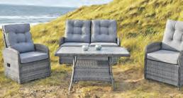 Aluminiumgestell mit Polyrattan dunkelgrau, bestehend aus 2 Sesseln, 1 Sofa, Rückenlehnen dank Gasdruckfeder stufenlos verstellbar und 1 Tisch 135 x 72 cm