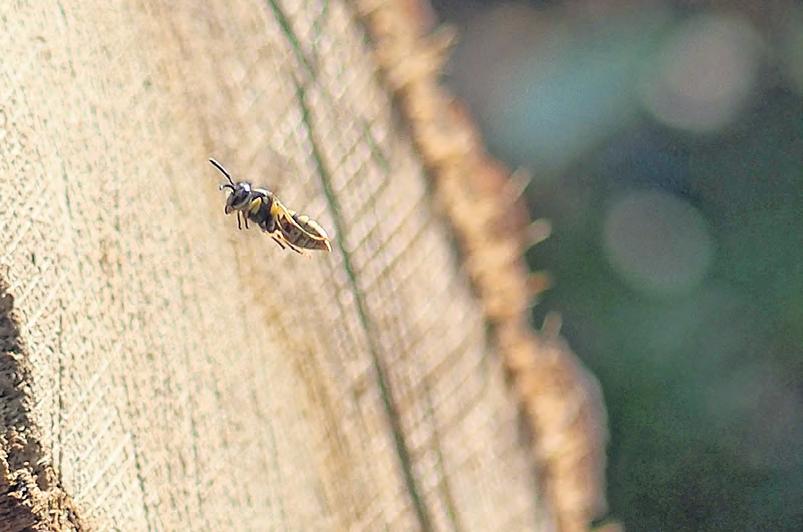 Die ersten Wildbienen sichern sich im Hotel „Zur alten Grenzeiche“ ihre Wabe.