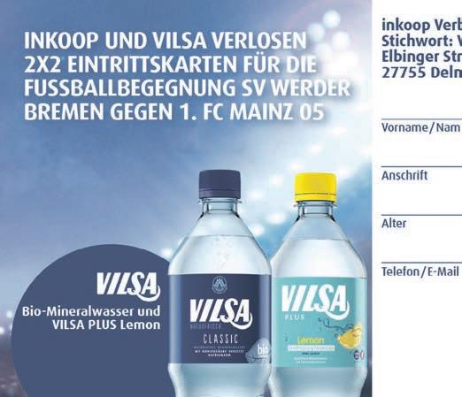 Unternehmen sowie deren Angehörige. Teilnahme am Gewinnspiel erfordert zunächst die Angabe von Namen, Anschrift, Geburtsdatum und Telefonnummer. Zu gewinnen gibt es insgesamt 2x2 Eintrittskarten für die Fußballbegegnung SV Werder Bremen gegen 1. FC Mainz 05 am 01.02.2025. Veranstalter des Gewinnspiels ist Inkoop Verbrauchermärkte GmbH, Elbinger Str. 32, 27755 Delmenhorst. Sollten Sie als Gewinner ermittelt werden, erfolgt eine Gewinnbenachrichtigung an Ihre Adresse oder Telefonnummer. Ausschließlich die Daten der Gewinner werden an VILSABrunnen Otto Rodekohr GmbH übermittelt. Die im Rahmen des Gewinnspiels von Ihnen übermittelten personenbezogenen Daten, werden ausschließlich zur Abwicklung des Gewinnspiels verarbeitet. Die Daten werden nach Beendigung des Gewinnspiels gelöscht. Die Datenverarbeitung für die Durchführung des Gewinnspiels erfolgt auf Basis Ihrer Einwilligung nach Art. 6 Absatz 1 Satz 1 lit a) DSGVO. Sie haben das Recht, eine einmal erteilte Einwilligung in die Verarbeitung von Daten jederzeit mit Wirkung für die Zukunft zu widerrufen. Durch den Widerruf der Einwilligung wird die Rechtmäßigkeit, der aufgrund der Einwilligung bis zum Widerruf erfolgten Verarbeitung nicht berührt. Die vollständige Datenschutzerklärung finden Sie unter: info@inkoop.de. Die Teilnahme über eine automatisierte Gewinnspieleintragung führt zum Ausschluss.