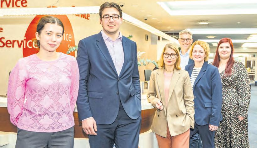 Geben einen Einblick auf die aktuelle Lage auf dem Ausbildungsmarkt: Die Auszubildenden Anna Schröder (v. l.), Jeroen Nijhof sowie die Bereichsleiterin der Agentur für Arbeit Oldenburg-Wilhelmshaven, Sarah Polek, der Leiter Geschäftsbereich Bildung bei der Oldenburgischen IHK, Stefan Bünting, die Leiterin für Personal und Ausbildung bei der Volksbank Oldenburg-Land und Delmenhorst, Tina Kotara und Ausbilderin Madelaine Maskow. Foto: