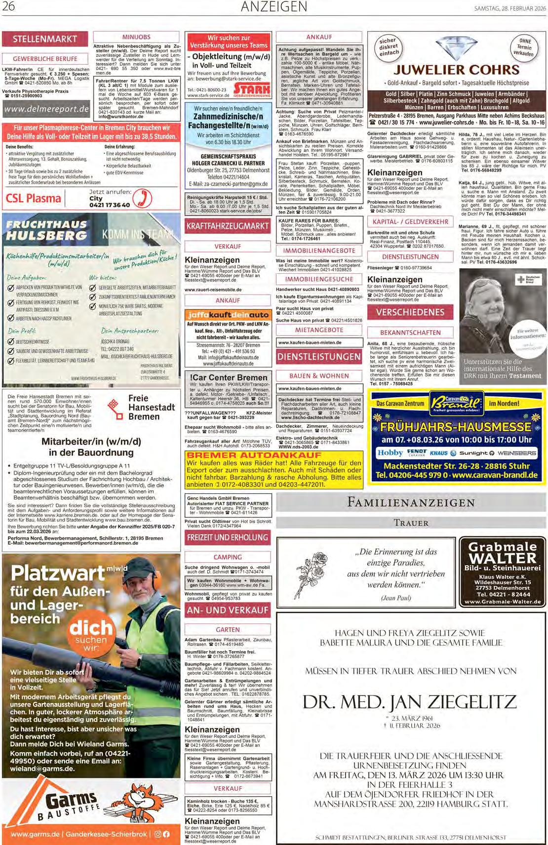 täglichen Einkauf. Unsere zuverlässigen Zustellerinnen und Zusteller sorgen dafür, dass Sie den Delme Report stets pünktlich im Briefkasten haben.