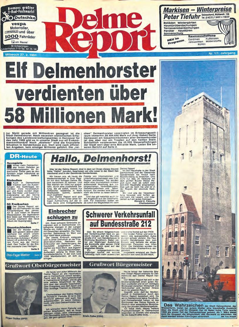 d er 27. Februar 1991 war ein besonderer Tag in der Geschichte der Medienlandschaft in Delmenhorst und Ganderkesee: Erstmals erschien der Delme Report als kostenlose Wochenzeitung. Und heute, 35 Jahre später, gehört der Delme Report zu den auflagenstärksten Wochenzeitungen in der Region. Wöchentlich versorgt Sie die Redaktion mit aktuellem und gewissenhaft recherchiertem Lesestoff aus Delmenhorst, Ganderkesee, Hude, Lemwerder und umzu.