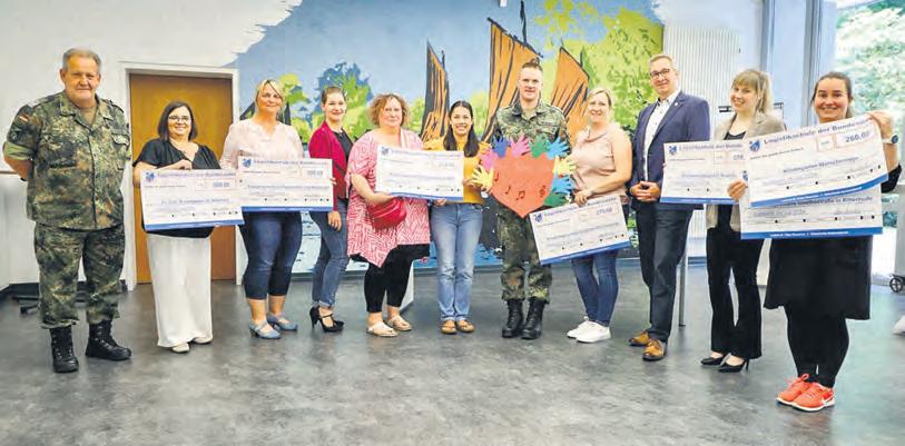 einrichtungen gebeten, Vorschläge für die Verwendung der Spenden einzureichen. Die Projektvorschläge wurden von der Logistikschule gesichtet und letztlich erhielten sieben Tagesstätten den Zuschlag. Jetzt wurden die symbolischen Schecks an deren Mitarbeiterinnen durch Oberstleutnant Kai Prozeske und Oberstleutnant Kantar im Kreishaus überreicht. Beträge zwischen 260 und 500 Euro können ab sofort für die Beschaffung von Musikinstrumenten oder Bühnenausstattungen eingesetzt werden. Gmyrek und Sanoska bedankten sich, auch im Namen der einzelnen Einrichtungen, bei den Vertretern der Logistikschule: „Ein herzliches Dankeschön an die Bundeswehr sowie an die vielen Spenderinnen und Spender. Mit dieser Hilfe können tolle Projekte gefördert werden, die den Kindern im Landkreis zu Gute kommen. Einen großen Dank richten wir daher auch an die handelnden Personen in den Kindertageseinrichtungen, die die sinnvollen Projektideen entwickelt und überzeugend verschriftlich haben.“ akl