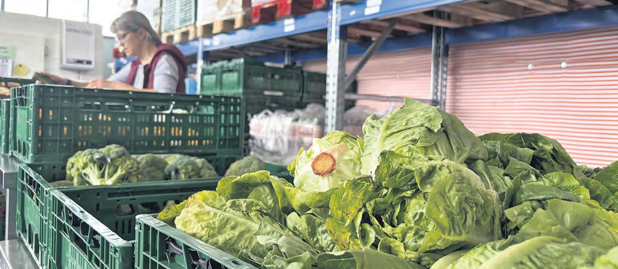 In der Halle an der Moorhauser Landstraße 41 stehen Metalltische, darauf stapelweise Kisten mit Obst, Gemüse, Milchprodukten. „Heute gibt es viel Salat“, erzählt Karin Giesecke dem Team, „da könnt ihr heu-