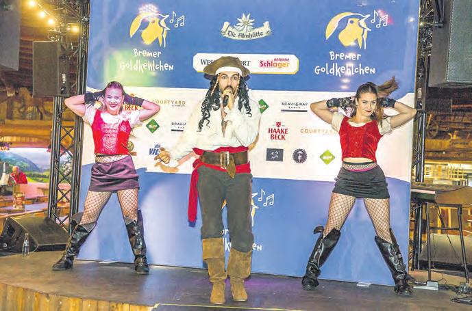 mung in der Almhütte. Mirjana brachte es mit ihrer akustischen Version von „Dein ist mein ganzes Herz“ ins Finale, das Publikum zeigte sich hier erstaunlich textsicher. Die erkennbar bühnenerfahrene Karla Serna nutzte die Gelegenheit für einen Kostümwechsel und trat in einem knallbunten Kleid auf die Bühne, in dem sie aussah wie ein Blumenstrauß. Diese beiden schafften es unter die ersten drei, mit „Es gibt nur Wasser, doch wir haben nichts zu trinken“ konnte „Captain Henry“ mit seinen beiden Tanzgenossinnen den Wettbewerb für sich entscheiden. Er darf sich nun offiziell Bremer Goldkehlchen 2025 nennen. Allen Finalisten war als Preis ein Fass Bier sicher, die ersten drei Plätze durften zudem Preisgelder in Höhe von 250, 500 und 1.000 Euro mit nach Hause nehmen. nik