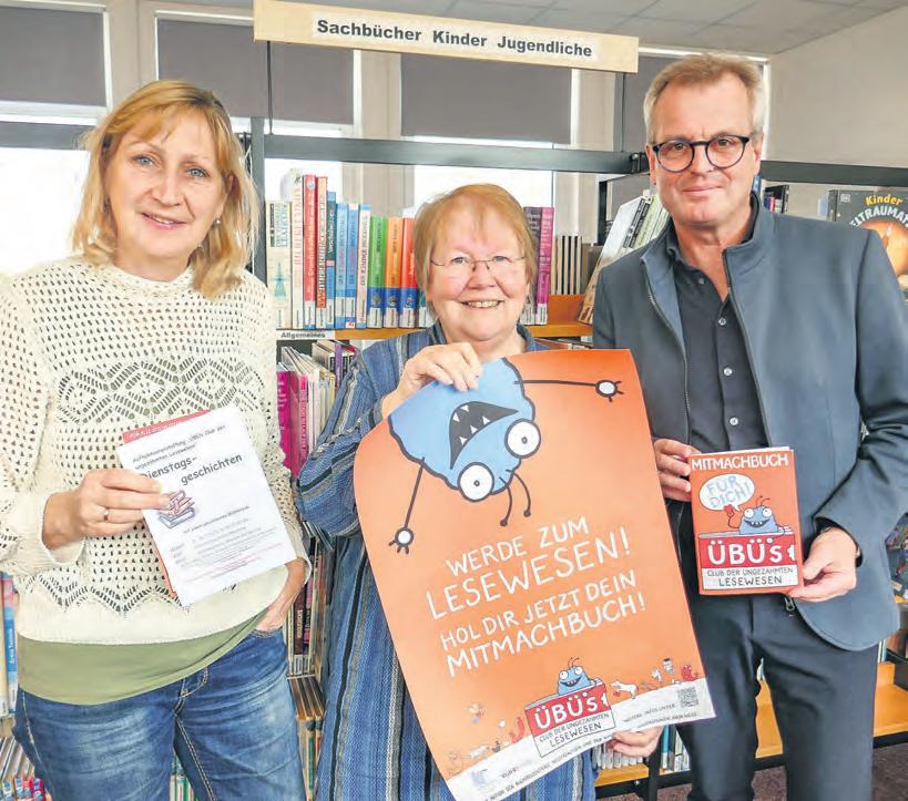 GRASBERG – „ÜBÜs und andere ungezähmte Lesewesen geistern bald auch in der Gemeindebücherei Grasberg durch die Regale“, kündigten das Bibliotheksteam, Evelin Meyer und Monika Weyers, an. Denn die Grasberger Gemeindebücherei beteiligt sich an der neuen Leseförderinitiative, die von der Büchereizentrale und der VGH Stiftung ins Leben gerufen wurde. Der neue Leseclub wendet sich an Grundschüler und -schülerinnen und er soll nicht nur zum Lesen, sondern auch zum Basteln, Rätseln, Malen und Schreiben inspirieren, berichtete die Leiterin der Gemeindebücherei, Meyer. Zusammen mit der ehrenamtlichen Mitarbeiterin Weyers und Klaus Müller von der VGH Stiftung stellte sie das neue Programm vor. Müller wünschte sich, dass Eltern das Lesen ihrer Kinder fördern; „vom Lesen hängt nämlich alles andere beim Lernen ab“, so der VGH-Vetreter. Die bereits seit mehreren Jahren angebotenen „Dienstagsgeschichten“ werden am kommenden Dienstag, 18. November, 16 bis 17 Uhr in der Gemeindebücherei zur Auftaktveranstaltung zum neuen „ÜBÜs – Club der ungezähmten Lesewesen“ für Grundschulkinder der ersten bis vierten Klasse. Die Lesekompetenz der Grundschüler sei total unterschiedlich, bemerkte Meyer. Ein buntes Mitmachbuch mit Rätseln und Malseiten soll die Schüler zum Lesen motivieren. Darin wird dokumentiert, wie viele Bücher sie gelesen haben: Zur ersten Stufe drei Bücher, in der zweiten Stufe sieben Bücher und in der dritten Stufe 13 Bücher, die innerhalb eines Jahres gelesen werden. Mit bunten Aufklebern und Stempeln wird die aktive Leselust bestätigt. Am Ende bekommt jedes Kind, das
